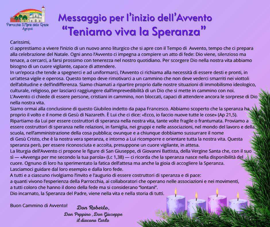 Il Messaggio del Parroco, don Roberto Guida, dei viceparroci e del diacono, per l’inizio dell’Avvento. E a seguire anche il Messaggio Video
